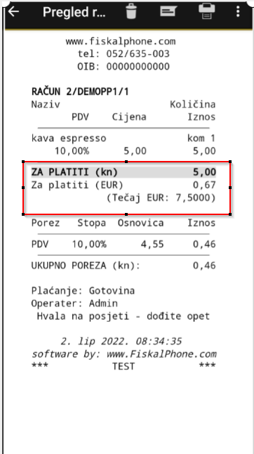 Zbog nadolazeće zakonske obveze dvojnog iskazivanja cijena najavljenog za 5. rujna, ukupan iznos računa moguće je, uz osnovnu, ispisati i u dodatnoj valuti tj. EUR-u.